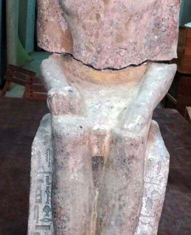 Mr. Adel Okasha said âDuring the excavation work the mission found inside the main shaft; a pink granite statue which was broken into two parts. The statue represents the tomb owner sitting on a small stall and wearing wig. The name and titles of the tomb owner in inscribed in the stall.