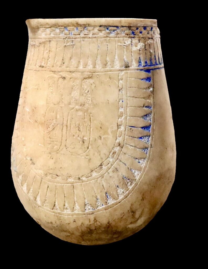Mohamed Abdel-Badie, Head of the Egyptian Antiquities Sector at the Supreme Council of Antiquities, highlighted the architectural significance of the tomb, explaining that it was constructed of mudbrick and consisted of a main burial chamber and three additional rooms. “The walls were coated with a layer of white plaster, and inside, we found a human skeleton covered with cartonnage, which dates to a later period than the tomb’s original construction. This suggests that the tomb was reused in a subsequent era,” he said. The mission also uncovered a collection of well-preserved alabaster vessels decorated with inscriptions and traces of color, including two cartouches bearing the name of King Horemheb, one of the most significant military leaders and warrior-kings of the 18th Dynasty.