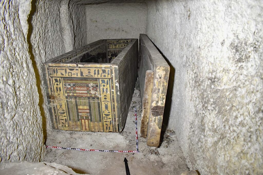 Dr. Mohamed Ismail Khaled, Secretary-General of the Supreme Council of Antiquities, explained that while the mission was cleaning the remaining shaft in Khafay-Hapi’s tomb, they discovered his daughter’s burial chamber at a depth of approximately 15 meters to the north. Inside were two nested coffins, intricately inscribed both inside and out with texts describing the journey to the afterlife.