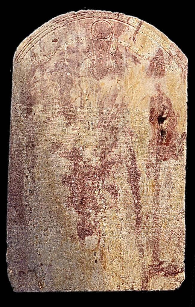 Mr. Mohamed Abdel-Badie, Head of the Egyptian Antiquities Sector at the Supreme Council of Antiquities, described the stela as being crafted in sandstone with a rounded top, measuring 127.5 cm in height, 83 cm in width, and approximately 48 cm in thickness. At its summit is a depiction of the winged solar disk, from which descend two royal uraei wearing the White and Red Crowns of Upper and Lower Egypt. Between them is the hieroglyph “di-ankh” (𓋹), meaning “He who is given life.”