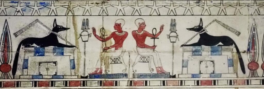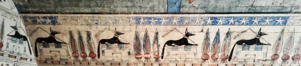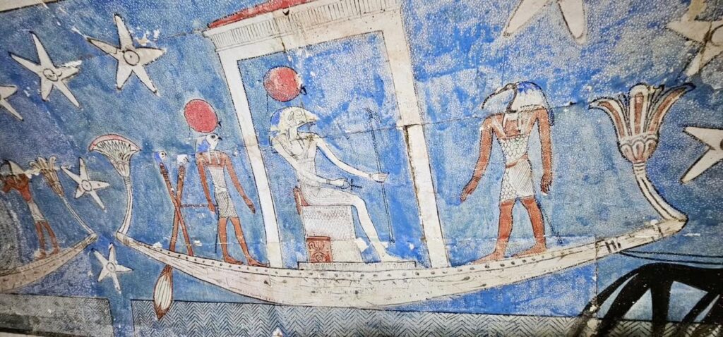 The ceiling of the chamber was decorated with a celestial scene of the sky goddess Nut, her white figure set against a blue backdrop adorned with stars. Surrounding her were sacred boats carrying solar deities like Khepri and Ra.