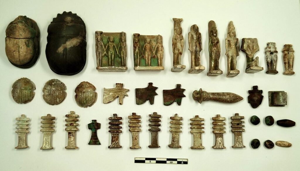 In one particularly evocative discovery, a heart scarab was found intact within a mummyâs chest cavity. Researchers also identified 29 amulets of the Djed pillar, a symbol of stability, alongside scarabs linked to deities, including Horus and Thoth. Some artifacts bore rare iconography that combined multiple deities, further enriching interpretations of Ptolemaic religious beliefs.