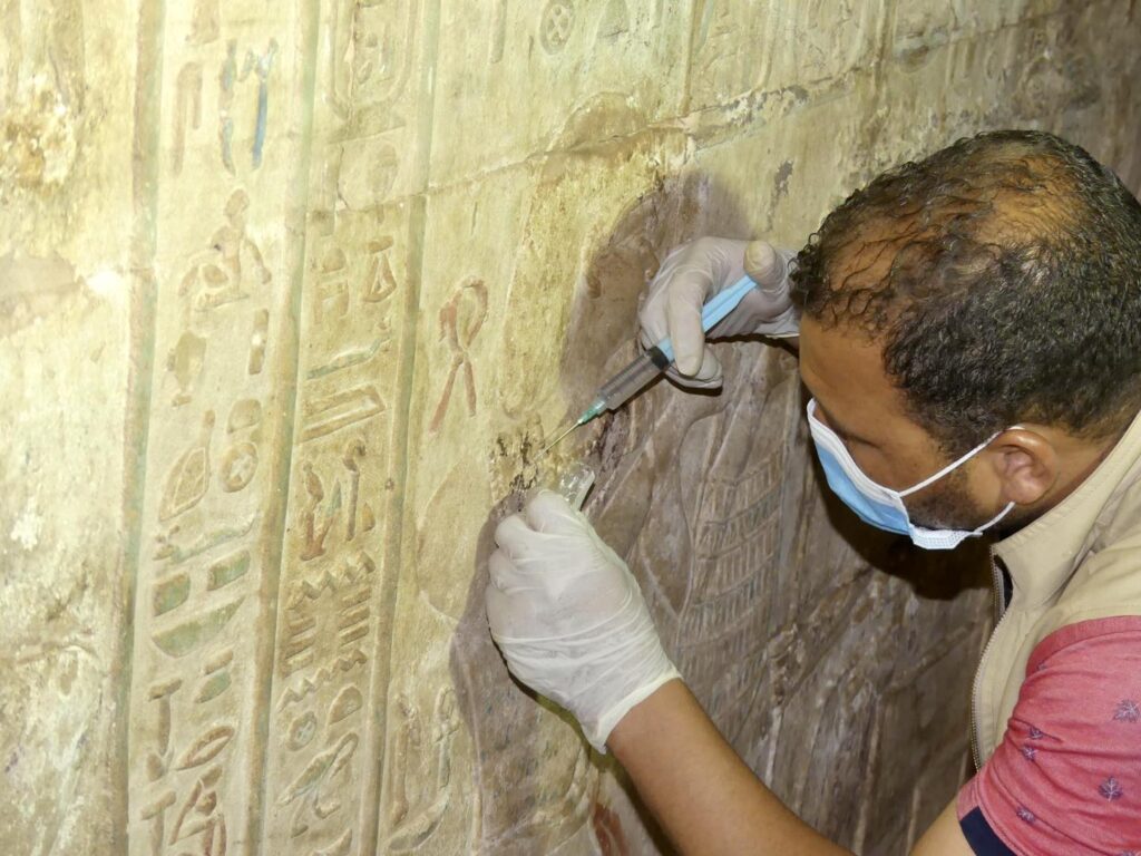 Project supervisor Ahmed Abdel Nabi mentioned that the team removed dirt, bird droppings, dust, soot, and salt deposits, which resulted in the discovery of the remains of the original colors that once covered the raised reliefs. He explained that the colors are currently being analyzed and restored to bring the scenes back to their original appearance when the temple was constructed.