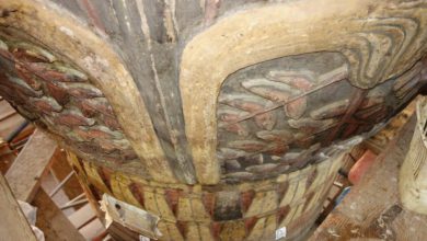 A restoration team of the Ministry of Antiquities is done cleaning and renovating wall paintings on the ceiling of Esna…