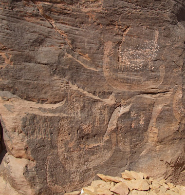 The significance of this discovery is the uniqueness of the rock art of the pre-dynastic era represents a procession of boats superintended by the King who is accompanied by 2 standard bearers, one fan bearer and a dog.”